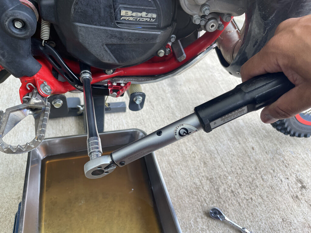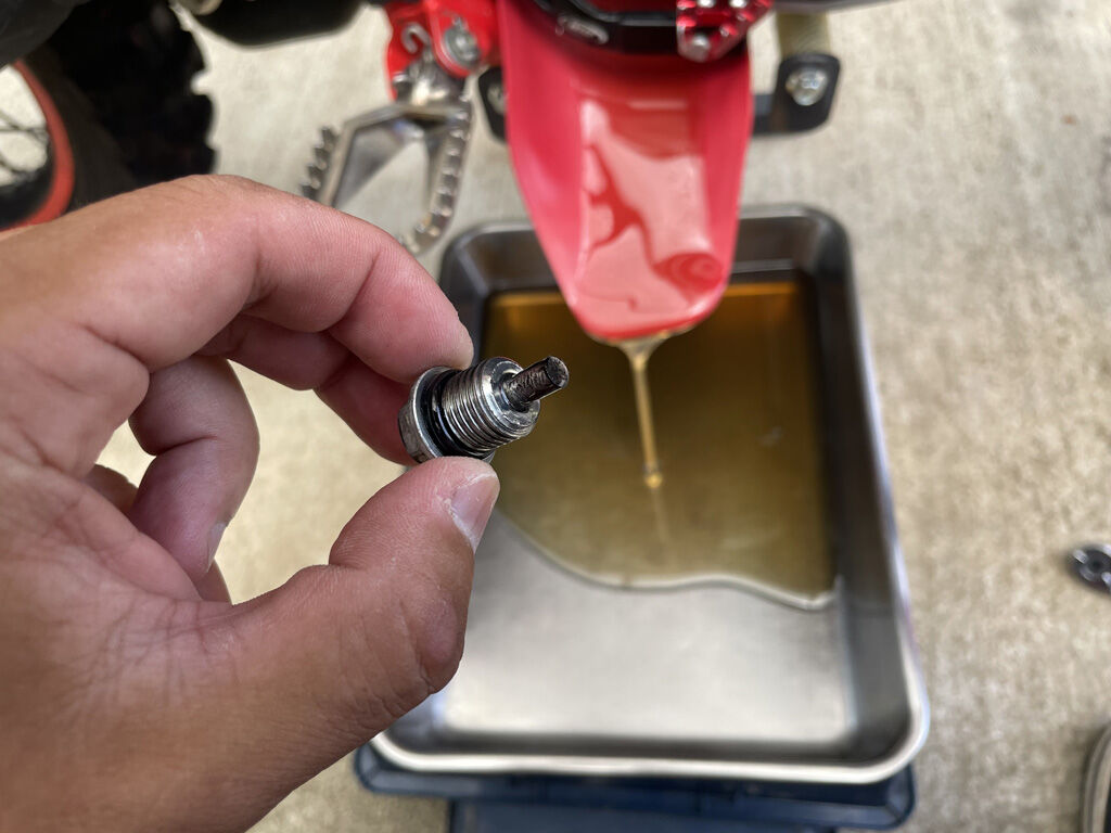 - オイルが抜けきったら、ドレンボルトを取り付け、最後はトクルクレンチで規定トルクで締める。