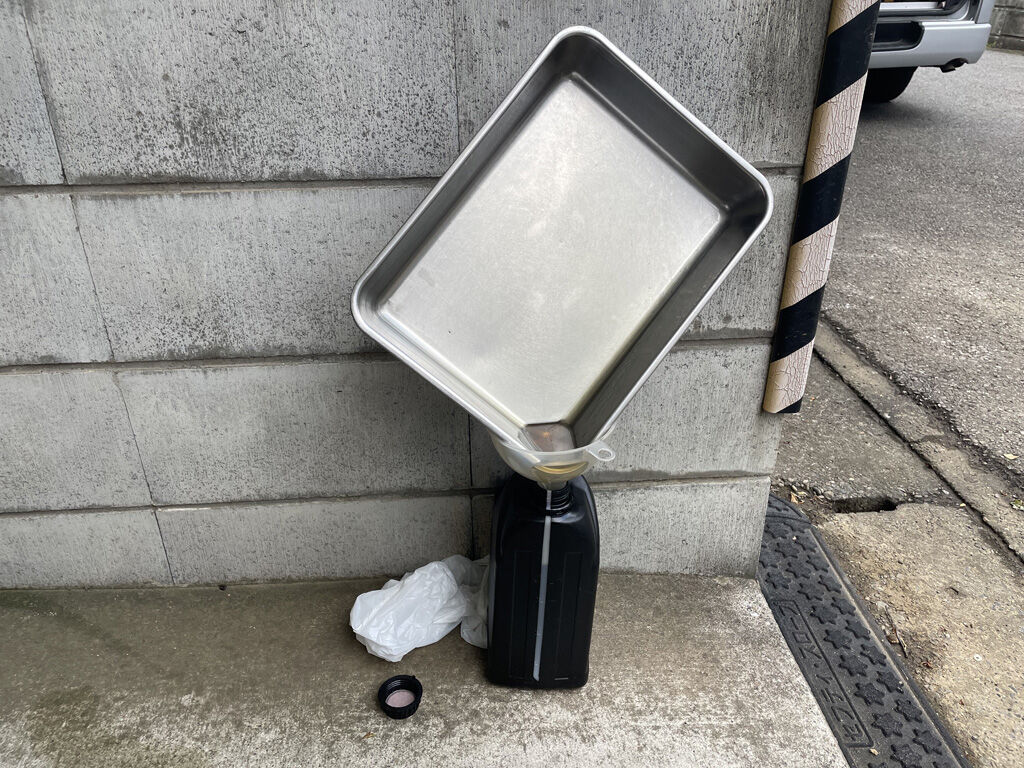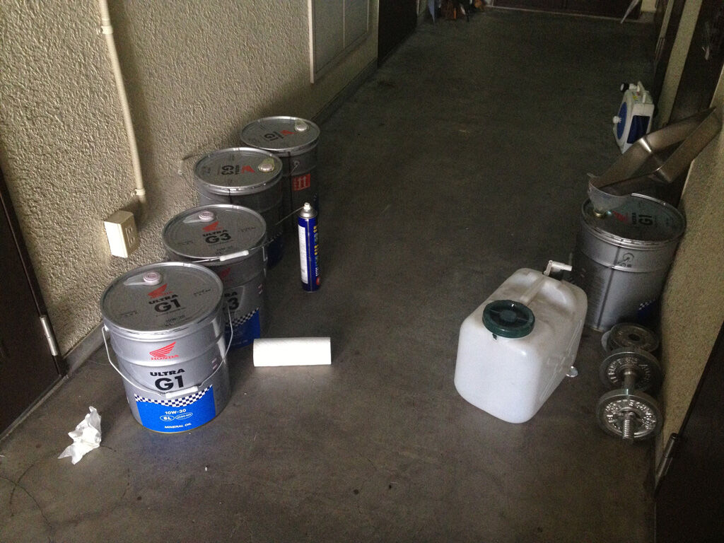 適当にやると、ナメてえらい事になります - 廃オイルを廃オイルボトルに入れる(オイルパンを壁にでも立てかけておく)