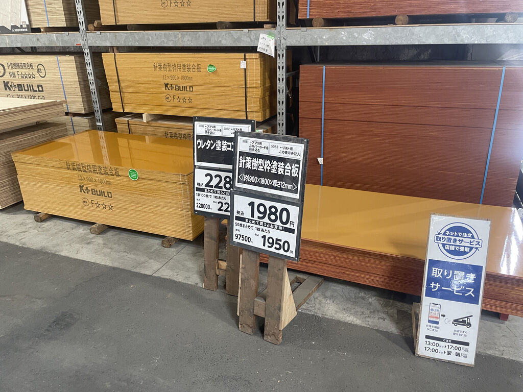 このうち、3〜5は近所のコメリで調達可能なのですが(特にコンパネはカットも頼まねばならないので、店で買う必要がある)、1と2はそこらのホムセンにはおいてません。注文すれば取り寄せ可能でしょうが、これらはネットで頼んだ方が楽です。
