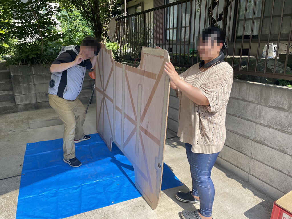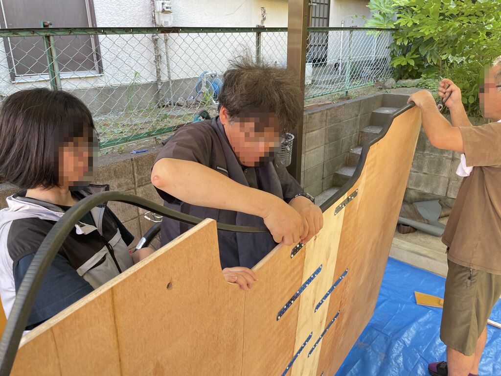穴あけが済んだら、前後の板を連結します。ここからは人手が要ります。連結した事で板は一人や二人では持ち上げられない重さになりますし、雑な扱いをすると連結したところで折れます。数人がかりでそろそろと持ち上げて、裏向けたり移動させたりします。
