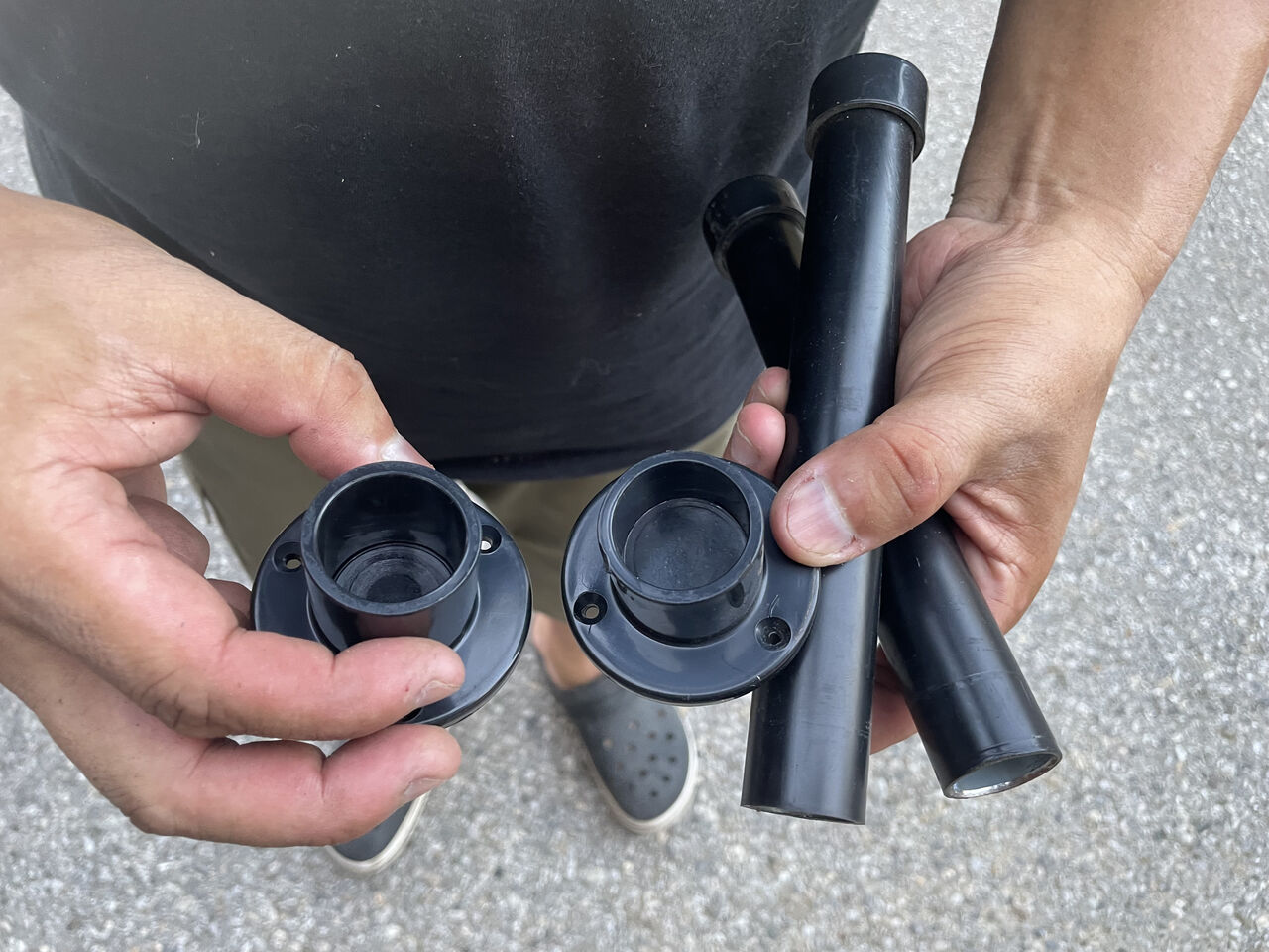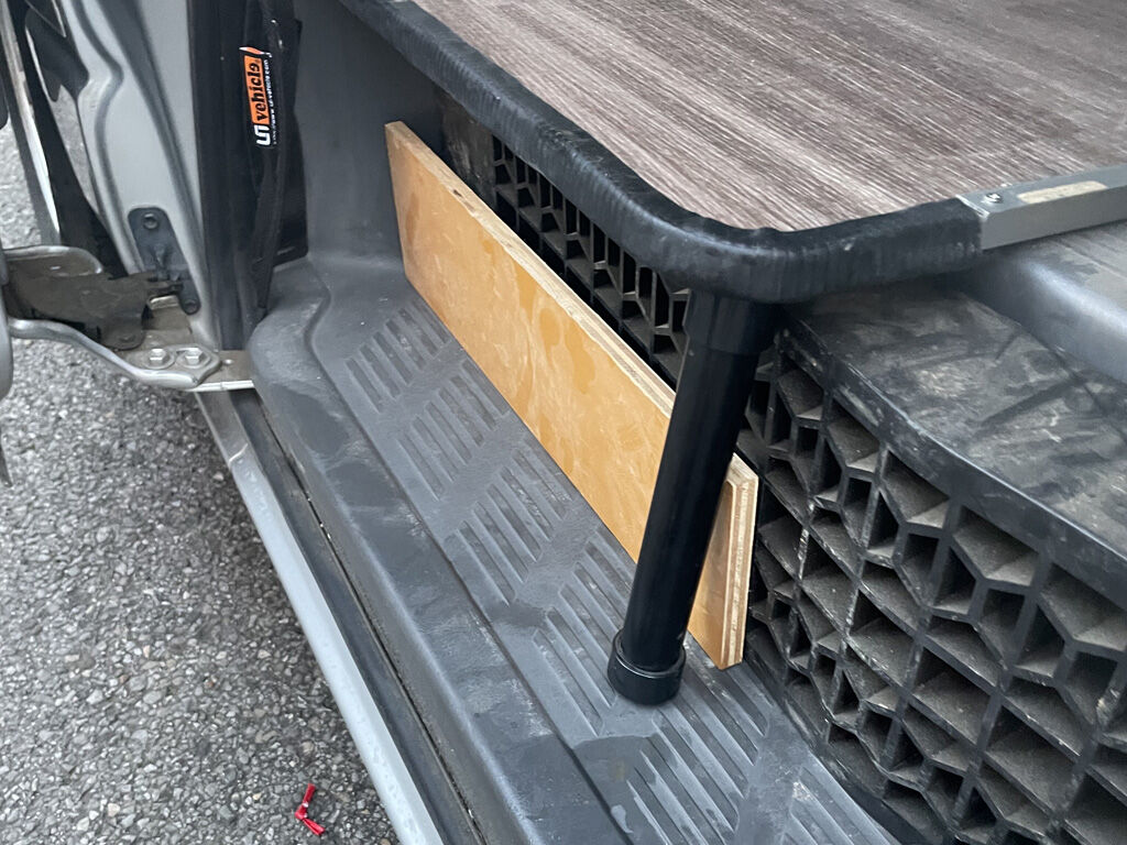 床板前方、スライドドアのステップの部分には、荷重に耐えれる様に、イレクターパイプで支柱を設けてましたが、これを取り付けます。前回のは、支柱の片方のジョイントが割れていたので、買い押してきました。ただ、これだけだと長さが足りず、あれれと思ったら、ジョイントの中にゴム板で上げ底がしてありました。仕方ないので、あまったビニール床を丸く切って上げ底にしました。