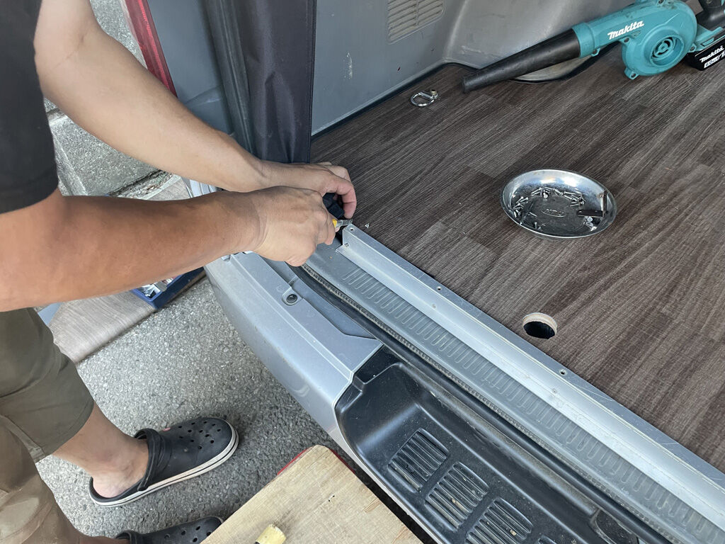 続いて、床板後端のアルミアングルの取り付け。アルミアングル自体は前のの流用です。後端部分は床板と床に若干の隙間があるので、コンパネ材の切れっ端を噛ませてあります。アングルの長さを測ってセンターの位置を割り出し、あまったトリムを切り取って、アングルをねじ止めします。