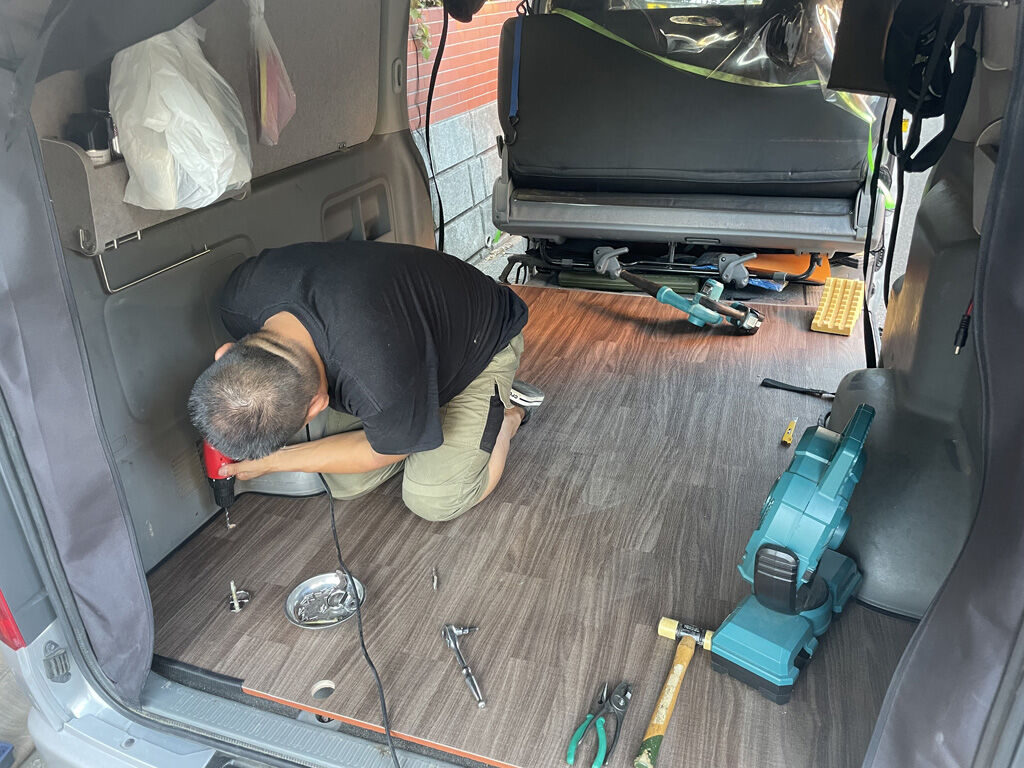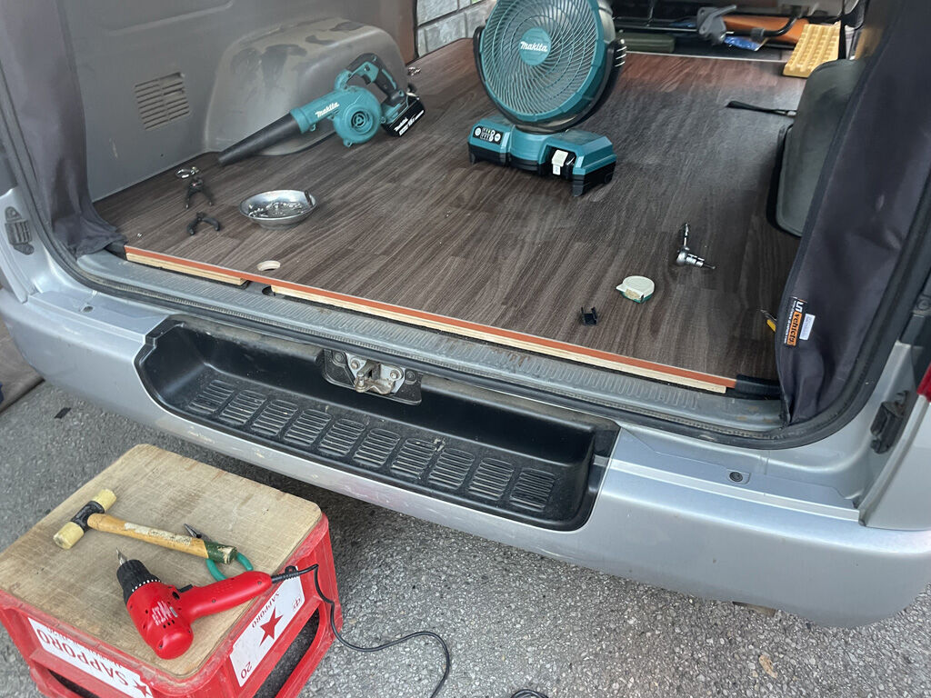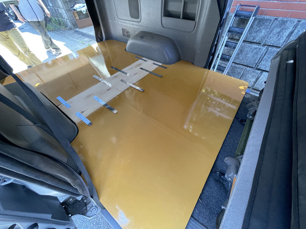 いよいよ床板の架装です。数人掛かりでそろそろと持ち上げ、斜めにして荷室に運び入れます。その際、小柄な人に荷室に後ろから上がってもらい、板の中央部を持ってもらい、板が前に進む連れ、スライドドアから出てもらうという技も使いました。そして、板は無事に荷室に収まりました。