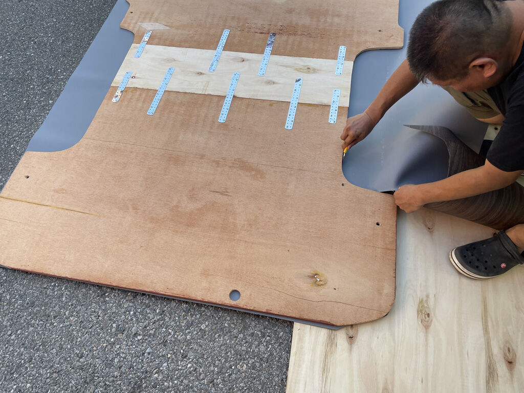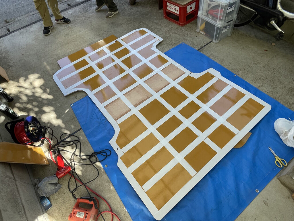 揃えれる材料は、予め揃えていきました。コンパネは正確なサイズを再確認するため、トランポから取り外してから改めて採寸しました。当初の予定では、穴の位置を変更する後方の板だけ作り変えるつもりでしたが、ビニール床を貼っていたテープの糊がえらい事になっていたのと、JASコンパネではクッションフロア用の両面テープの食いつきが悪かった事から、前方の板も作り変える事として、コンパネ材もウレタン塗装のものにしました。ちなみに、サイズは前方が87×146cm、後方が90×149cm。お大まかなカットは、ホムセンでやってもらいました。