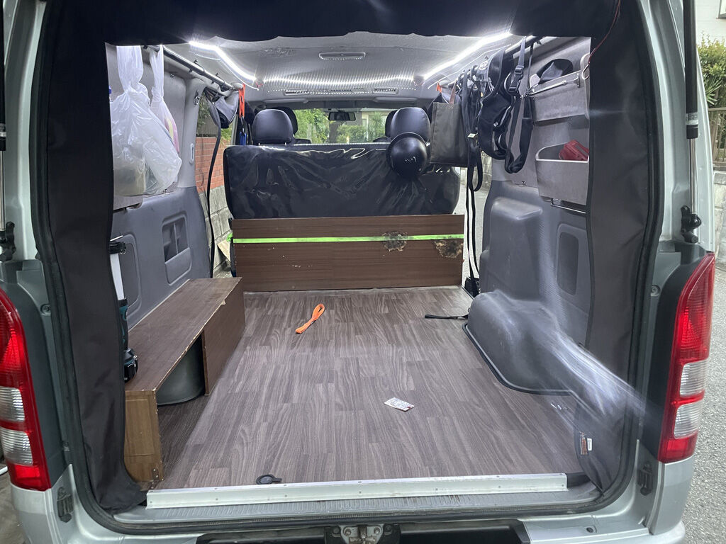 このあとは、タイヤハウスの棚を取り付け、リアシートの裏にバイクのフロントタイヤを押し付ける板を取り付けて、作業完了しました。