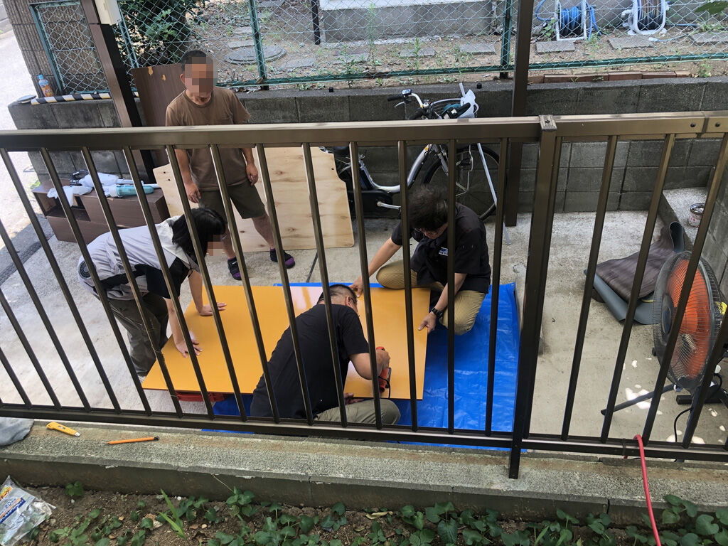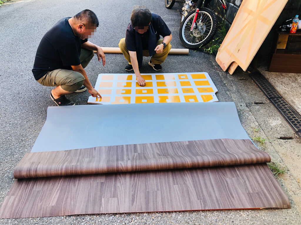 まず、板を表を上にして、クッションフロア用のテープを全面に貼ります。この際、板の縁や穴の部分は念入りに貼り、隙間が開かない様にします。そして、その上にビニール床を広げて置き、後方の端のテープを剥がして一旦ビニール床を貼り、後方から徐々にテープを剥がしつつ、ゆっくりビニール床を貼っていきました。
