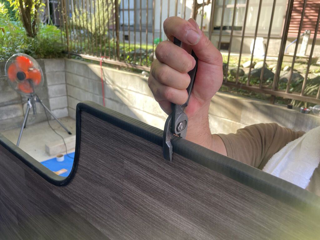 今回、このトリムの付け方の最適解が分かりました。前回はのべつプラスチックハンマーでしばいてましたが、それではグラグラにしかつきません。まず、一人がトリムを押さえつける様に縁にはめ込んでいき、もう一人でプライヤーでトリムを締めていく。そうする事でトリムの中の金属プレートが締まって綺麗に留まっていきます。ハンマーを使うのは曲線部分で、トントン叩く事で、曲線の形にトリムが決まっていきます。お陰で前回よりも綺麗な仕上がりになりました。