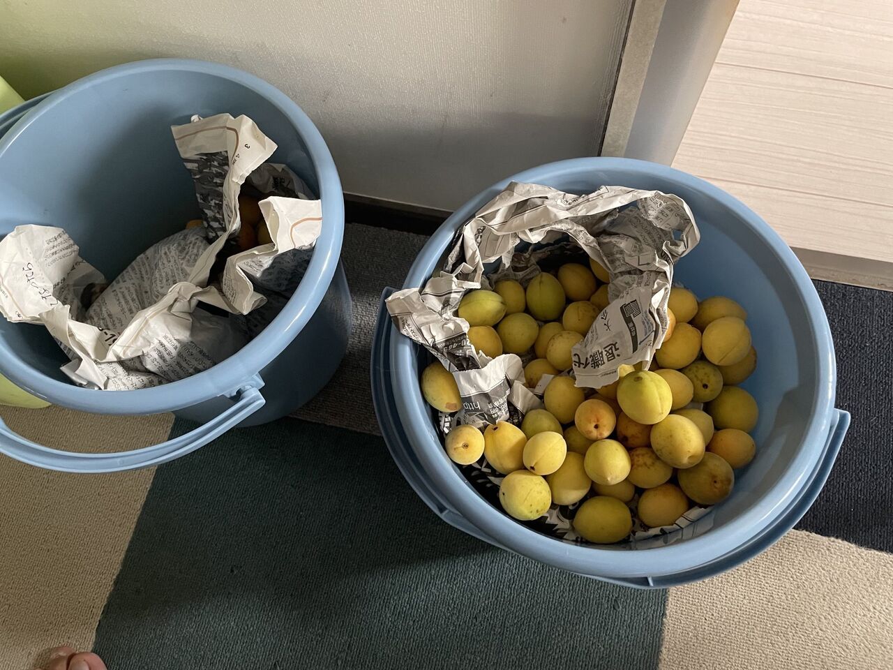 今回は、嫁はんのご実家から青梅を貰う事になりました。いつも栗を送ってもらっているのですが、栗ができる様な所は、梅もできるのです。送ってもらった量は、約6キロ。既に2キロは予約が入っていましたので、4キロ分がウチ用です。傷んでるものを弾いて、それは梅シロップに回し、あとはバケツにし梅と新聞紙を交互に重ねて、3日間、黄熟させます。