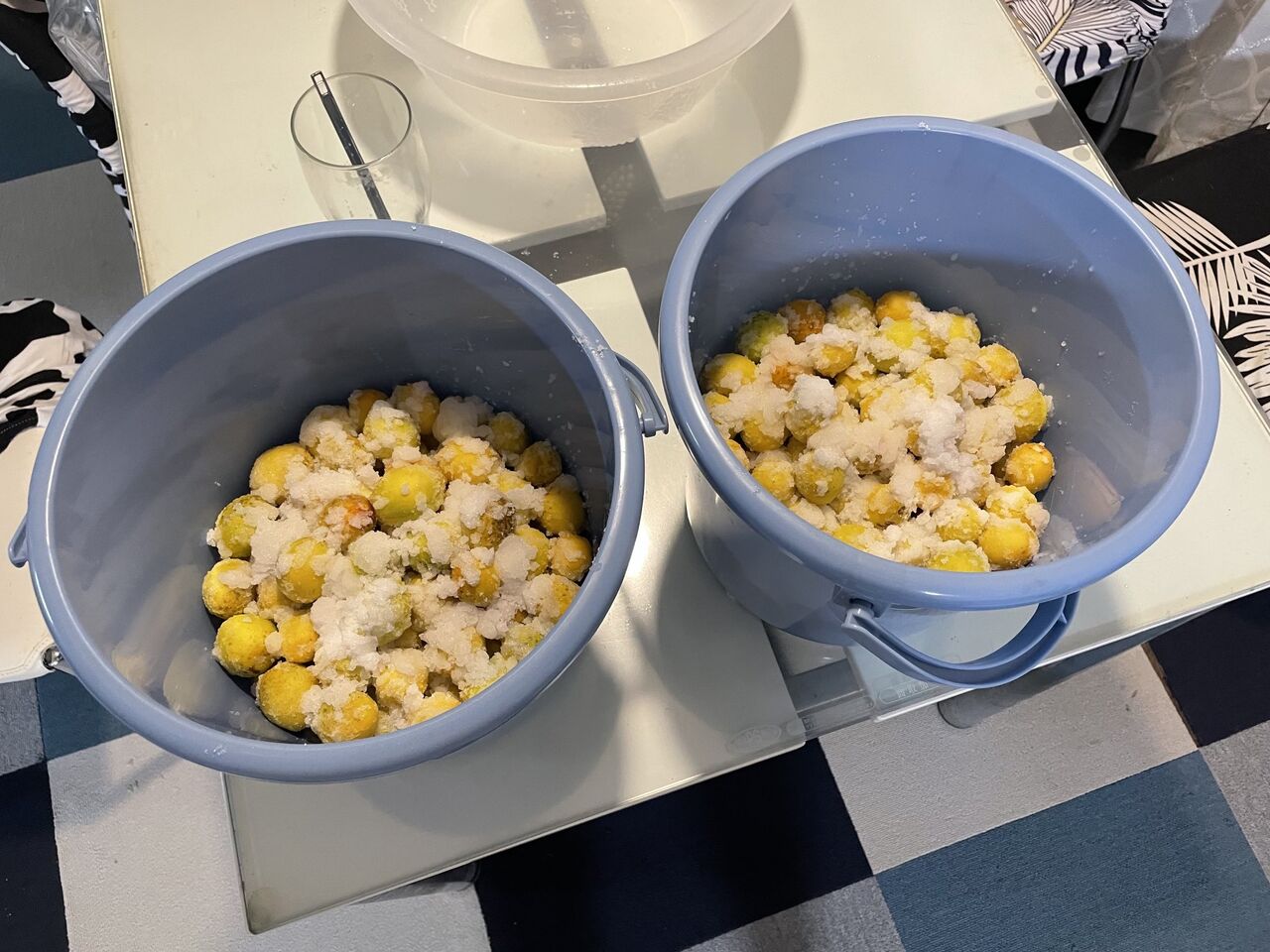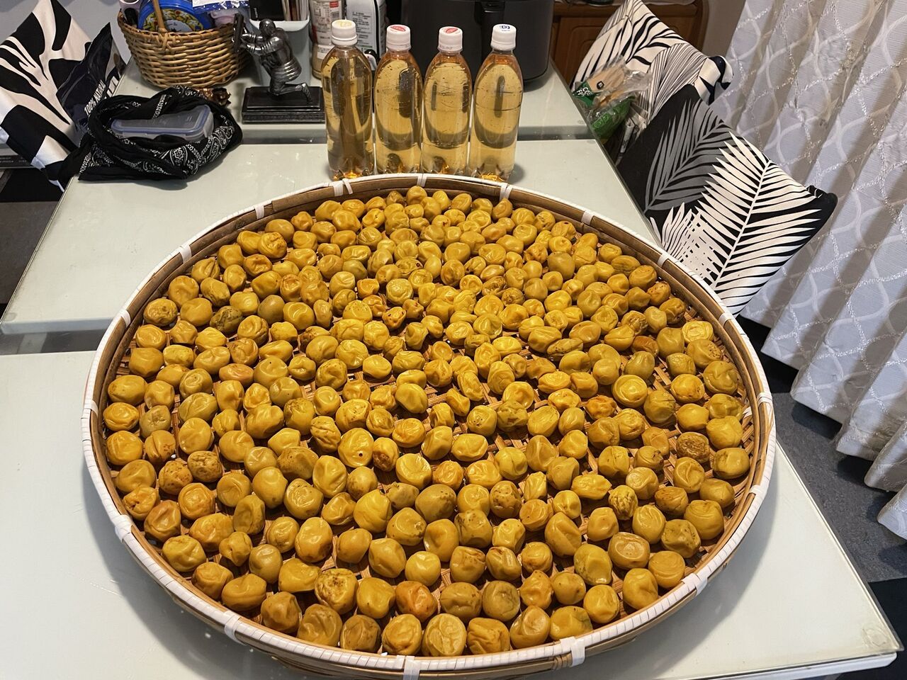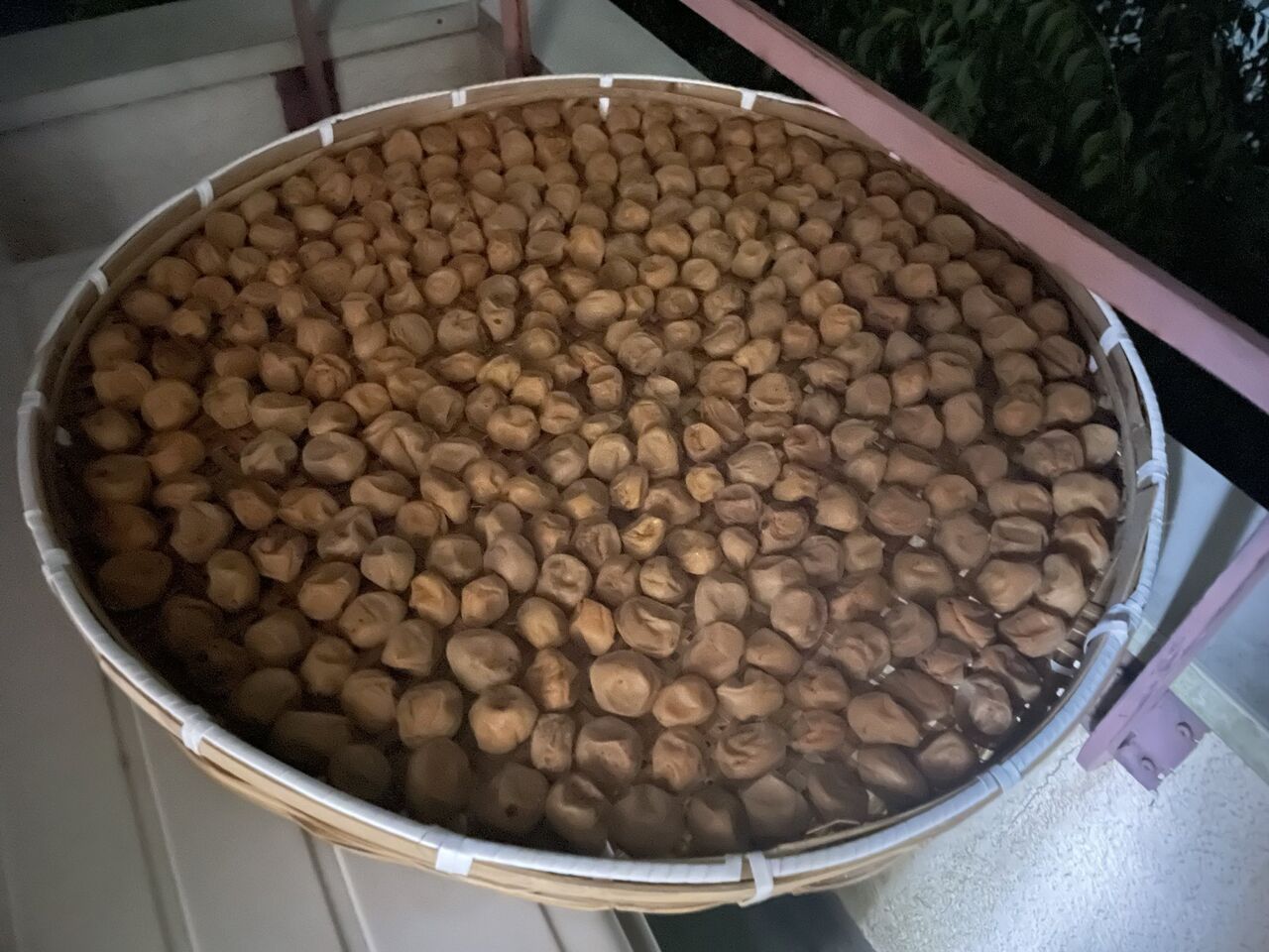 ただし、運悪く雨が降りそうなときは、一時的に屋内に退避させます。というのも、雨を被ると、梅がカビたりしますし、また雨は案外、雑菌が含まれていますので、もし雨を被った場合は、ホワイトリカーで梅を拭うという、面倒くさいリカバリーが待っています。そして、風味も落ちますので、決して雨に濡らさない様にしましょう。