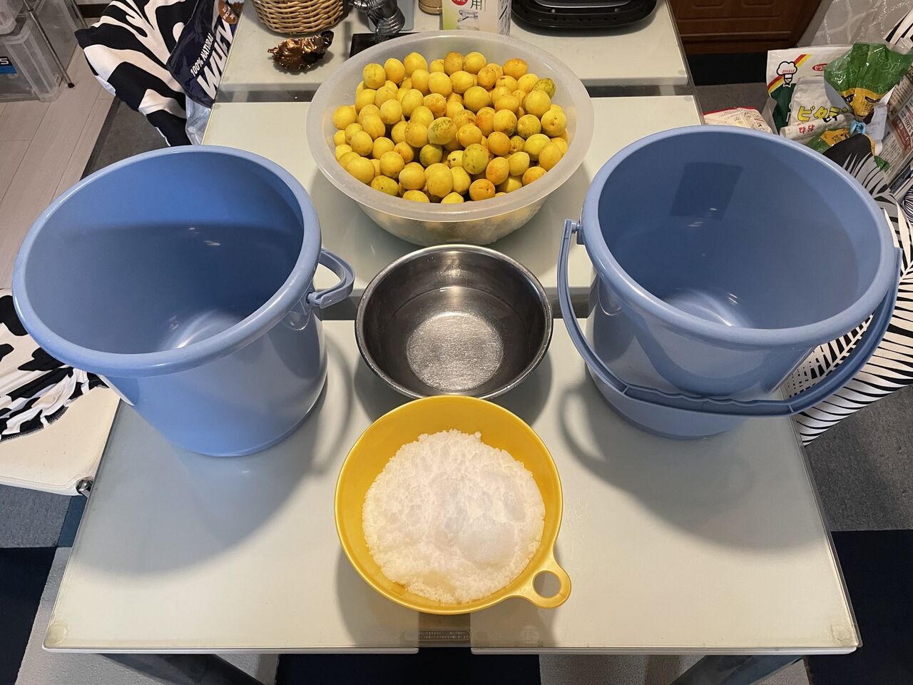 準備するのは、梅の総量の20%の粗塩、ホワイトリカーです。ホワイトリカーはでかいパックのでしか売ってませんが、それを使い切る事は絶対なく、数年前に買ったのを毎回使ってる感じです。塩が20%というと、仮に梅の総量が5キロだとして1キロの粗塩が必要という事になります。