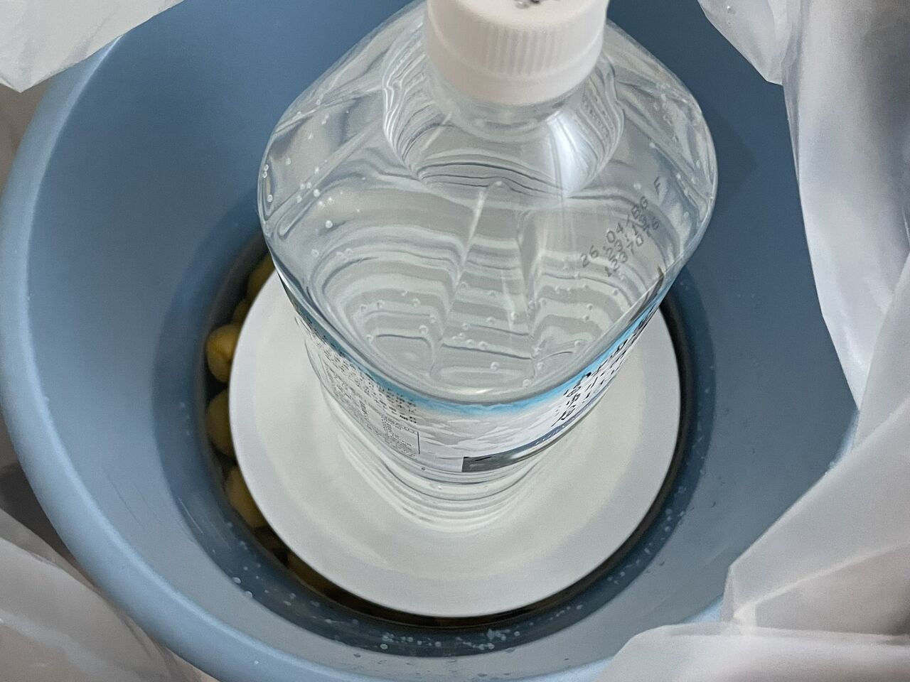 この作業が済んだら、梅を入れたバケツを、でかいごみ袋の中にいれ、梅の上にバケツのサイズくらいの皿を置いて、重石を乗せます。重石は水入りのペットボトルなどで構いません。バランスよくペットボトルをおいたら、ごみ袋の口を括って、放置します。