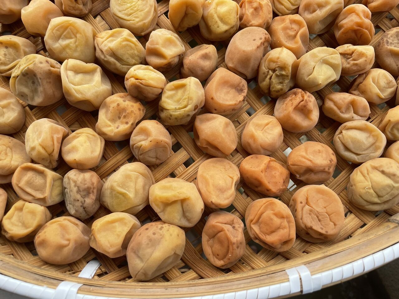 梅干しは、その名の通り、天日に干す事によって、風味がよくなり、かつ紫外線の殺菌効果で日持ちも良くなります。写真からもわかる様に、バケツから引き揚げたばかりの梅は、まだ黄色のですが、天日が当たると、薄桃色に変わってきます。
