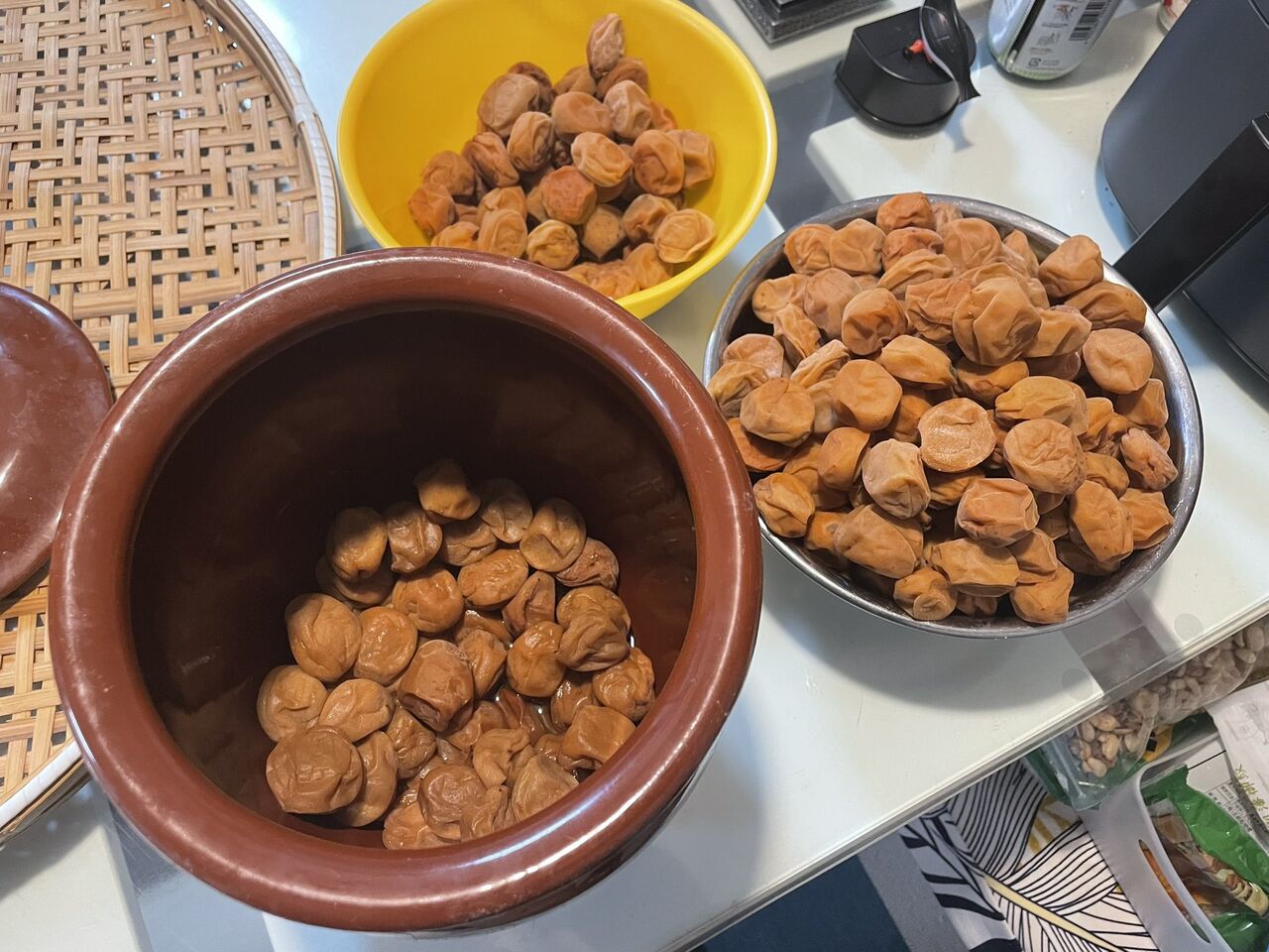 塩をした梅に重石すると、浸透圧で梅から水分が出てきます。これが梅酢で、梅干しは元々は梅酢を取るために作ってたとか。