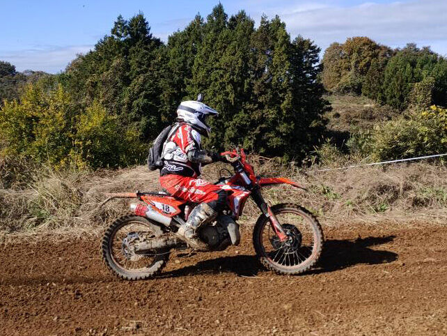 ライダーズミーティングのあと、下見ラップに出発。まぁ、昨日、試走していて、安全に走れば大丈夫なのを確認していたのですが、丸太でいきなり前転してしまい、今日はなんか調子悪いかも、と感じました。前日走行では、何の問題もなかったのですが。