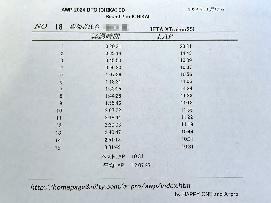 平均タイムは、前回が9分台だったのに、今回は11分台。2分も遅いのですから、まぁその分周回数が少なくなるのも頷けます。Bクラス1位との周回数の差は4周。これではBクラス優勝はかなり難しいです。まぁ、今回は安全第一で走ったので、仕方ないですが。