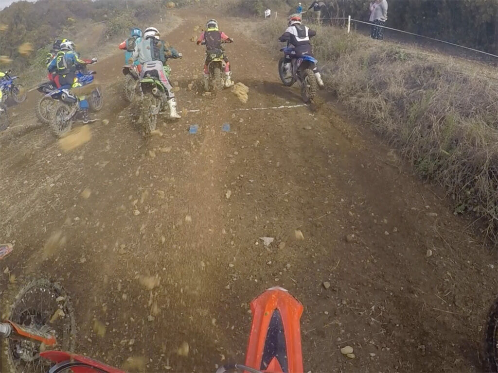 その後、マイペースで走ってた(これがレース時の標準タイムになる)のですが、桑畑から上がっていく坂で、やっぱりスタックがあって渋滞に。試走の段階ですでに左のラインも掘れ始めており、ここは気合抜けたらいかんなぁ、という感じでした。