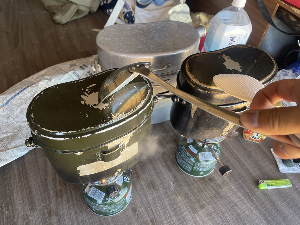 1130時、つまり食事時間の30分前に炊飯開始。飯盒2個並べて炊くのはお手物のなので、なんらトラブルなく炊き上がり、蒸している間に、吉野煮を温めなおしてトロミをつけ、時間通りに完成。お仲間に飯上げに来させ、「全員に分配せよ」と指示しました。ちなみに、この日、女子祭りには35人も参加したそうで、おそらく余るまいと考えていました。