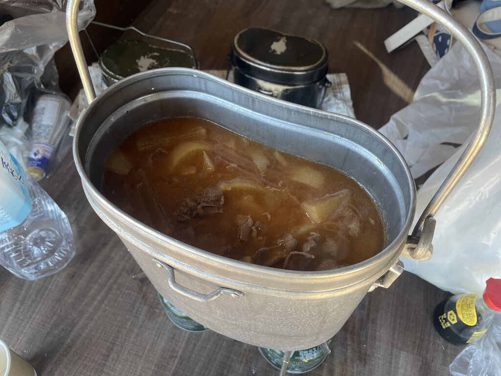 材料も8人分となれば結構な量で、夏場に使うクーラーボックスいっぱいになりました。作り方は、軍隊調理法に書いてある通りで、しかも、それほど手間のかかるもんではないですが、何分、量が多く、かつ自分ひとりでやらねばならないので、時間がかかります。それでも、普段から料理してる関係で、包丁さばきなど手間取る事もなく、ばりばり大根切って皮剥いて、ブテオンに放り込み、バーナーの上で煮込みにかかりました。ちなみに、うっかりひっくり返っても困るので、ブテオンの耳金のところにフックをつけて、荷室の天井から紐で引っ張る様にしていました。