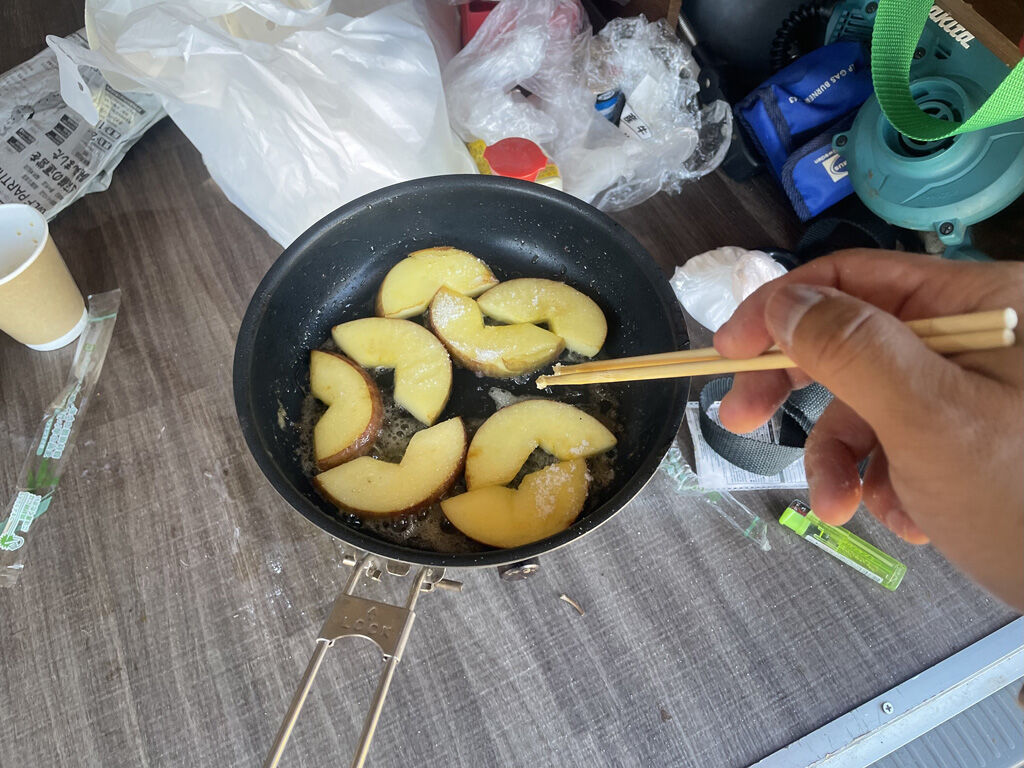 ケーキもマロングラッセやマロンクリームも引き渡し、続いて焼きリンゴ。ただし、こっちは手こずりました。というのも、ワンバーナークッキングで、リンゴ3個を6回に分けてやらねばならず、非常に時間が掛かった。せめてフライパン2個あれば仕事が早かったのですが。