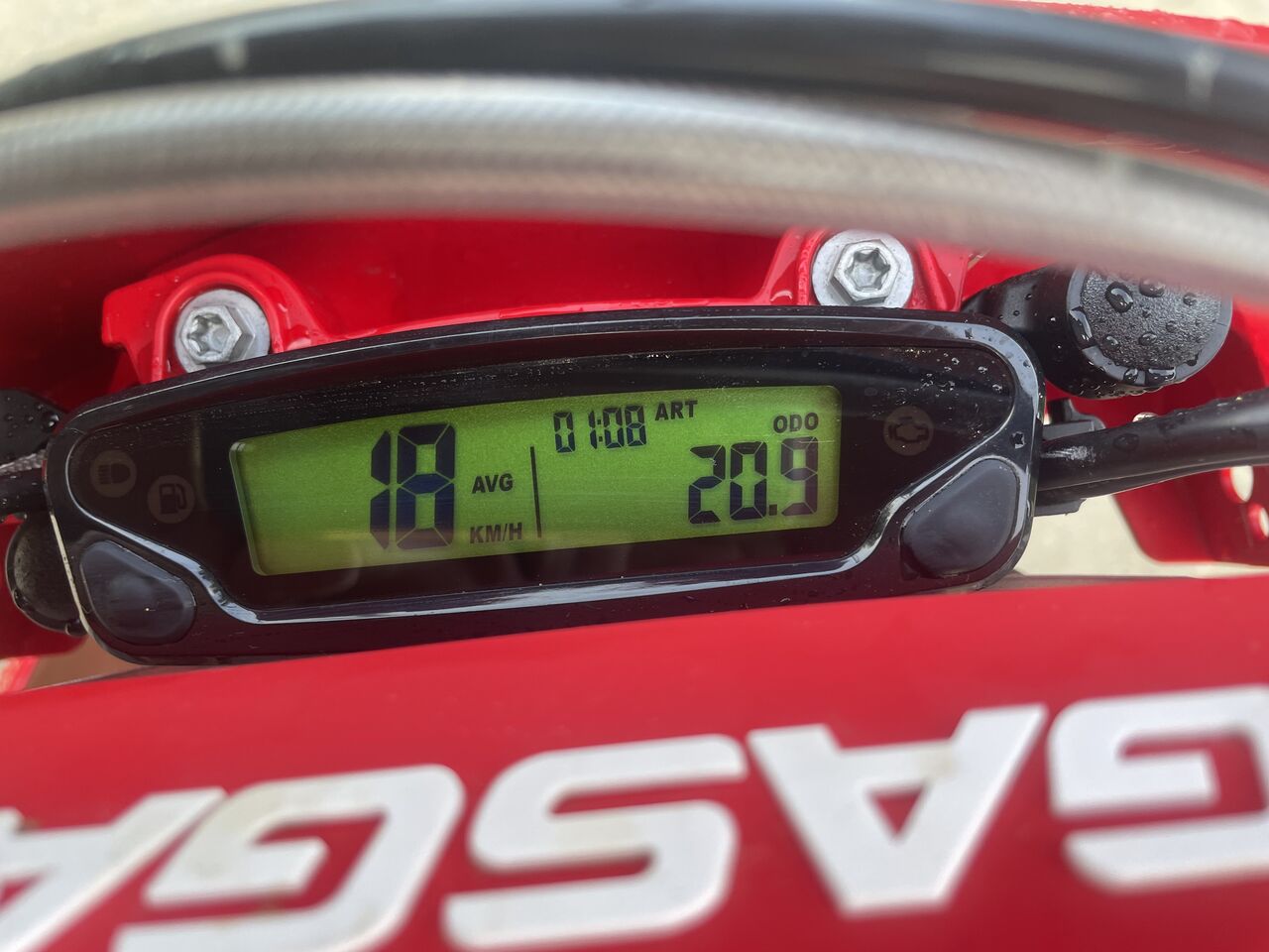 昔のCRFもそうでしたが、インジェクション車ですので、リザープがありません。つまり、ガス欠になるときはいきなり、という訳です。もっとも、GASGAS EC250Fはタンク容量が9リットルもあって、かつインジェクション車なので、相当の航続時間を持っていると予想できます。また、純正のデジタルメーターには、リザーブマークのインジケーターもついているので、それが純正のメーターを残す一番の理由になりました。実際の航続時間は、ガス欠になるまで走ってみない事には分からないので、慣らしが済んだらやってみようと思います。