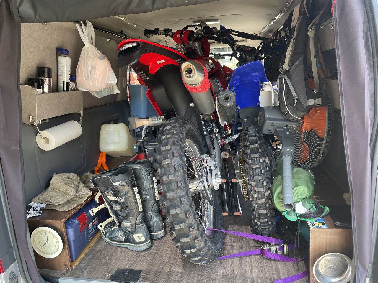 さて、トランポに積んでみたのですが、やっぱりクロトレよりは車高が高いと見えて、車体を若干斜めにしない事には、切ったハンドルの端が荷室の天井に当たる感じでした。気なったのは、ハンドルをフルロックにしても、荷室のアオリが閉まりきらないかも?という事でした。