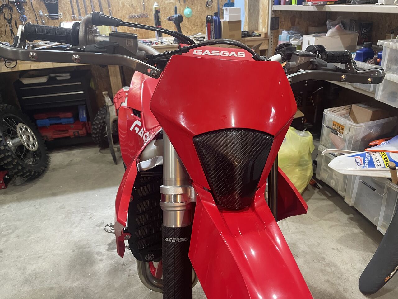 メーターは、今回は純正のをそのまま使う事に。Betaの時は、使い買ってと正確性が悪かったのと、ぶつかったりすると直ぐ壊れてしまうので、取り外して社外のアワーメーターを使ってましたが、GASGASのは視認性と操作性が良く、堅牢そうなので、そのままにしました。 ちなみに、メーターを使うためには、ライトカウルのままにせねばならず、モトクロッサー用のフロントゼッケンに変える事は出来ません。ライトカウルには強烈に明るいLEDヘッドライトが付いてますが、日中しか走らないので、JIMMY TECのカーボンダミーカバーに付け替えました。
