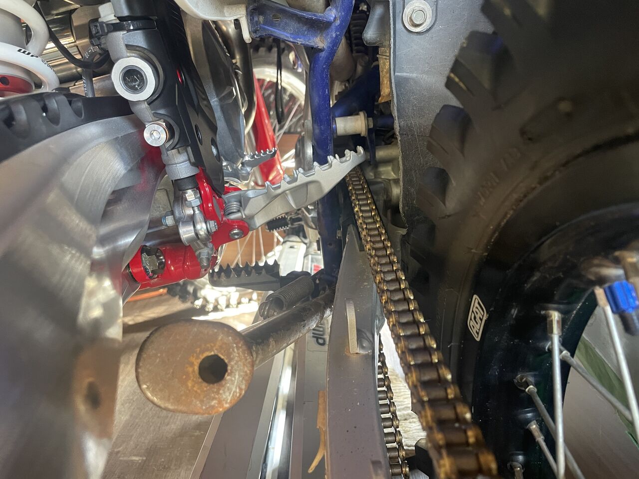 フロントディスクガードを使い回したのは上に書いた通りですが、今回はリアディスクガードはオミットしました。直接の理由は、注文したエンデューロ・エンジニアリングのにGASGAS指定のがなかった、というものでしたが、仮にガードがあっても、それ自体が歪んでしまったら走行不能になってしまいますし、また岩ゴロゴロの所に行かないので、まぁ要らんでしょ、って事になりました。
