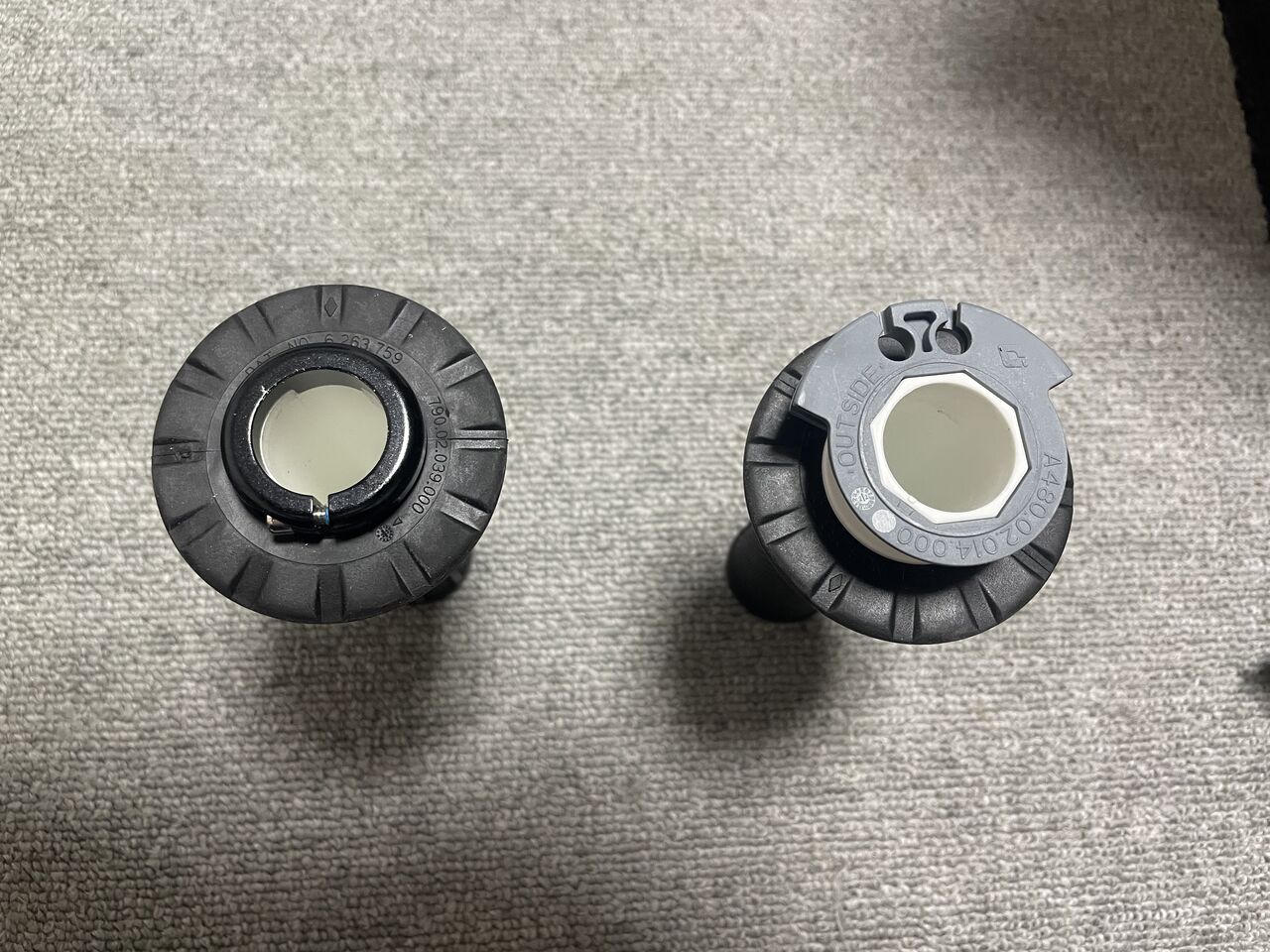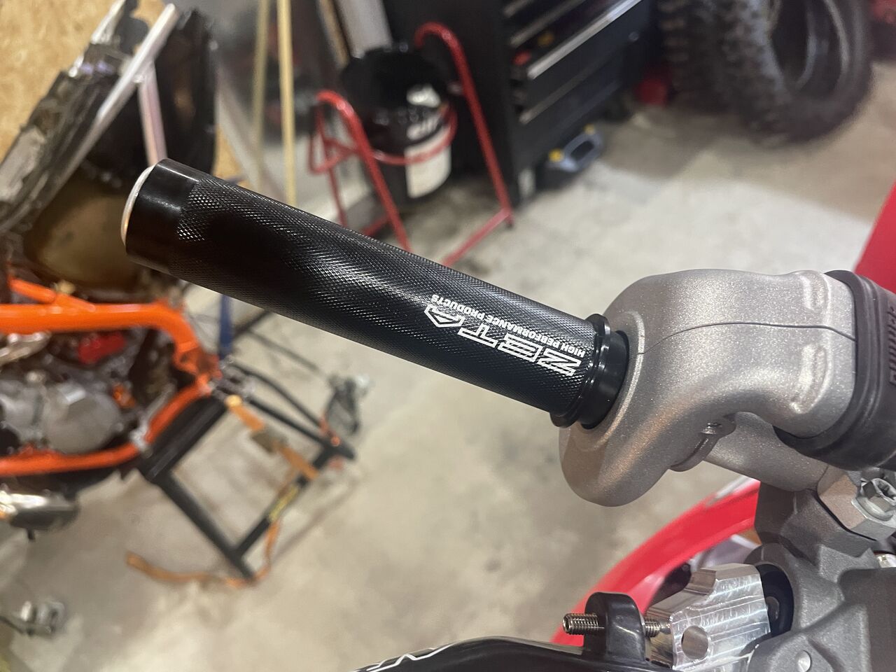 ZETAのアーマーハンドガードはクロトレからの使い回しですが、これを付ける為には、グリップやスロットルチューブのエンドに穴あけをせねばなりません。ところが、最近のグリップはチューブと一体型のロックオンタイプという事で、左は単に外せば良いだけですが、右のスロットルチューブはZETAのアルミニウムスロットルチューブ(ZE45-7225)に変える事になりました。ちなみに、純正のスロットルチューブは出荷時はロースロのカムがついていて、カムを交換する事で、ハイスロに出来たりするそうです。グリップはこれまで通りCRFのに交換し、GASGAS純正は取っておく事にしました。