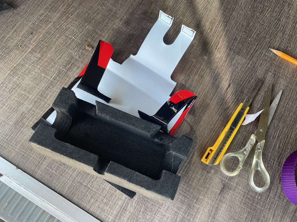 このマウントは、バークランプから生えてる格好になるので、通常のファットバー用のバーパッドが使えません。しかし、そのままマウントが剥き出しというのも危ない気がしましたので、ファットバー用のバーパッドをマウントが出る部分をカットして、付けれる様にしました。
