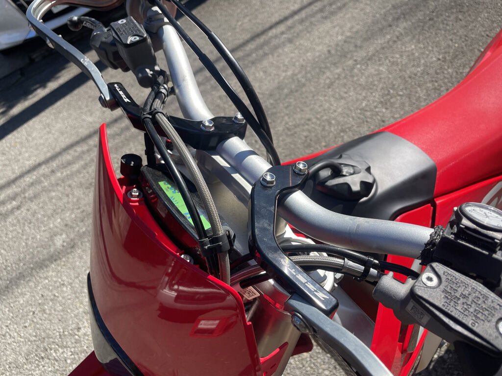 正味の話し、この位置にこんなマウント付けて、派手に転けた時にどっかしら歪んでエライ目に遭いはしないか、とも思ったのですが、背に腹は代えられないので、取り寄せる事にしました。ちなみに、CRF250R、XR230には、フロントフォークのアッパーブラケットのネジの取り付けるハンドガードマウントを使ってた事があって、自分が転けるレベルでは不具合が出ませんでした。