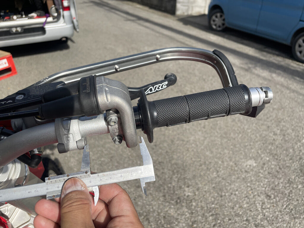 クラッチ側は、セルスイッチとキルスイッチを並べて付けている関係で、グリップとブラケットの間隔はもともと50mmだったのですが、アクセル側は今回の調整で50mmとなりました。その結果、極めてガッチリとグリップをホールド出来る様になりました。